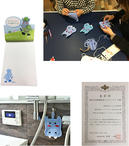一二三工業所がプレゼンテーションしたのは、お客様に配布するマスコットキャラひふみんのPRグッズ(メモ帳と、洗剤いらずのアクリルたわし)を、雑貨製作を手がける福祉作業所に対して定期的に仕事を依頼するビジネスプラン。福祉作業所で働く人たちのやる気アップと活性化につながればと考えています。